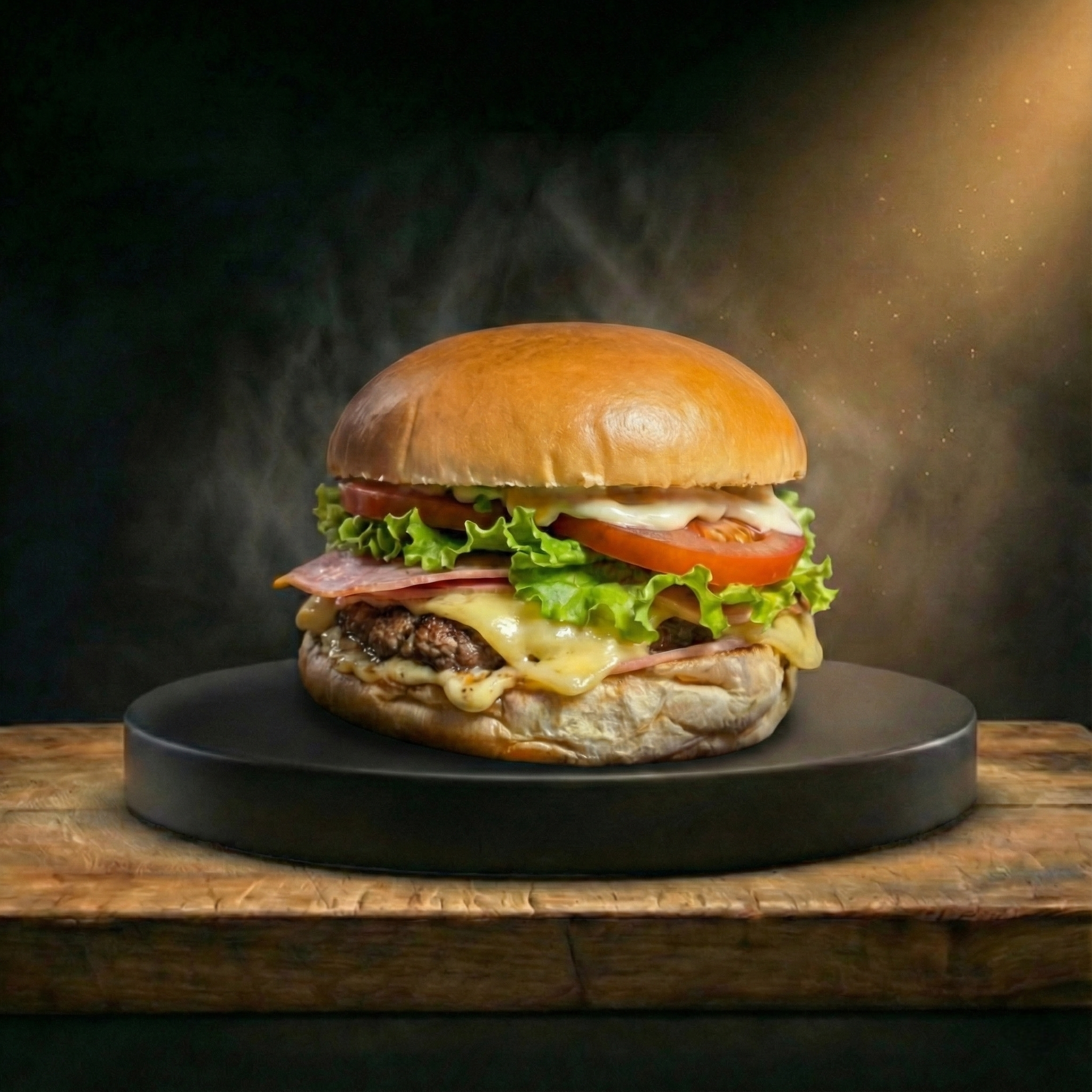 Ingredientes: Pão, um blend ARTESANAL 100g, alface, tomate, mussarela, presunto, e maionese da casa.