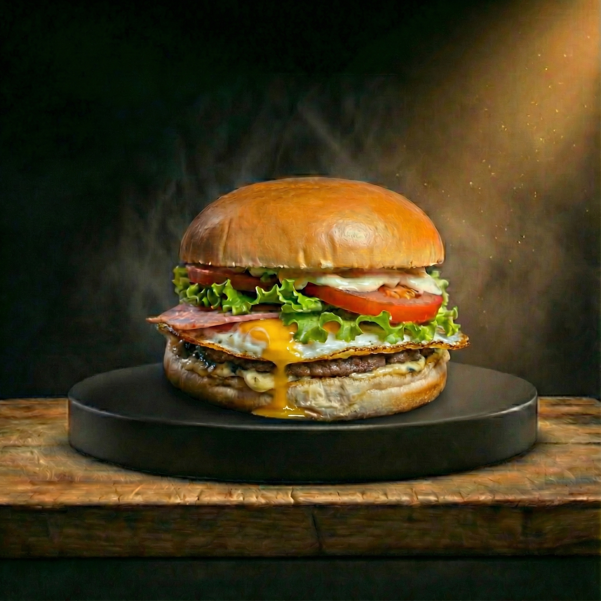 Ingredientes: Pão, um hamburguer industrial 56g, alface, tomate, mussarela, presunto, maionese da casa e um ovo.