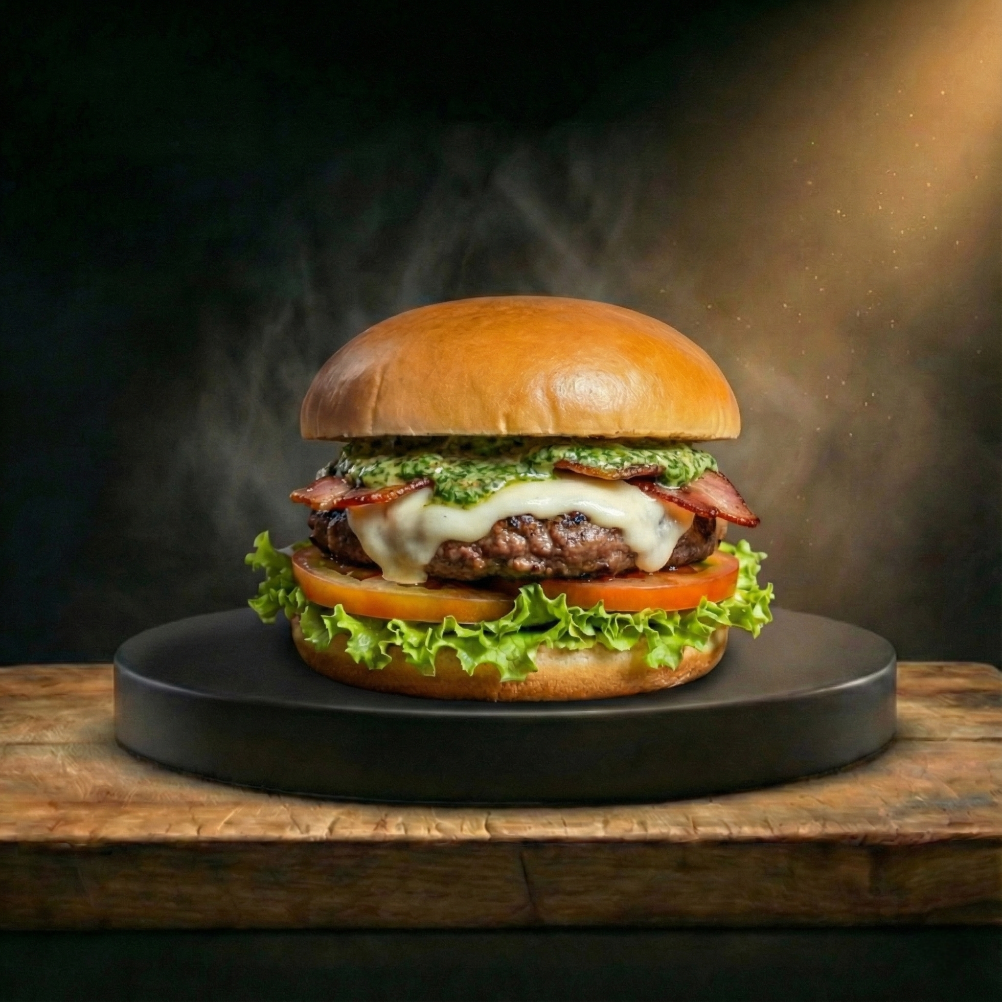 Ingredientes: Pão, um blend ARTESANAL 100g, alface, tomate, milho, mussarela, presunto, bacon, batata palha, maionese da casa e um ovo.
